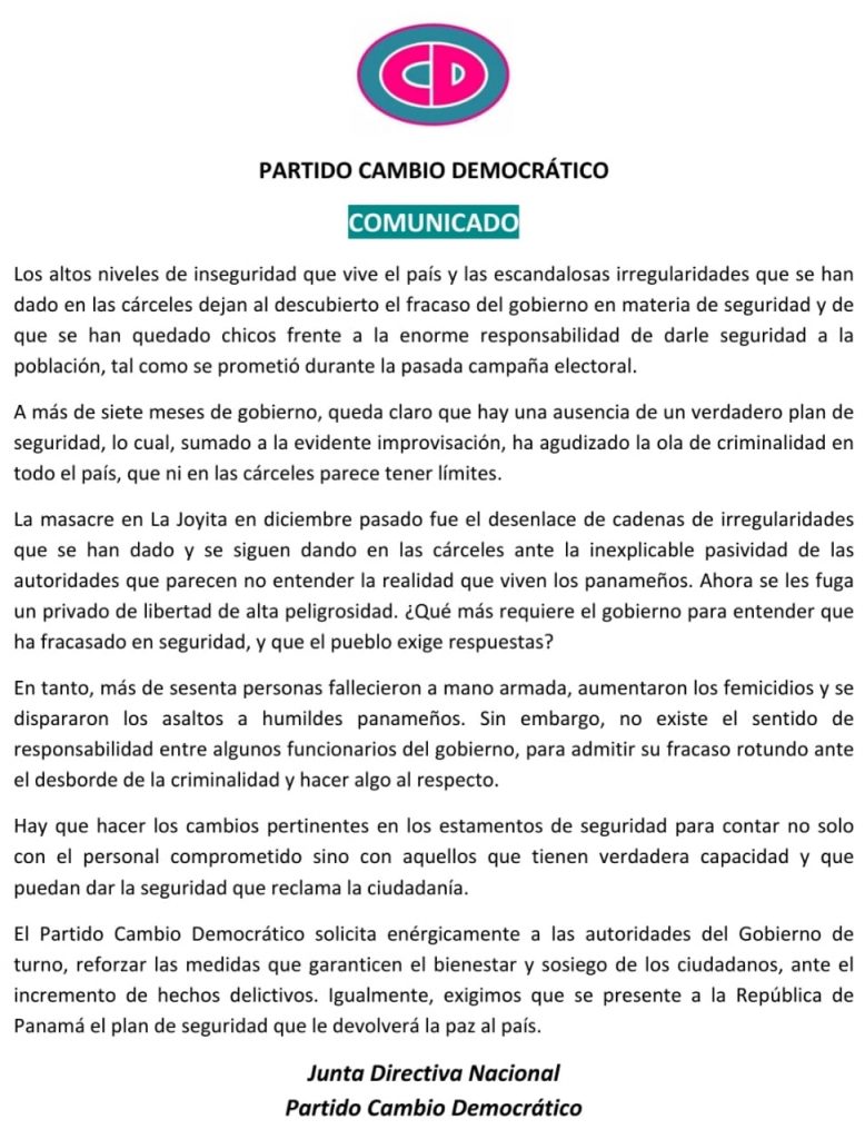 El Partido Cambio Democrático expresó ayer su gran preocupación ante los altos niveles de inseguridad que vive el país, haciendo un llamado a las autoridades para que refuercen las medidas que garanticen la seguridad de los residentes en el país.