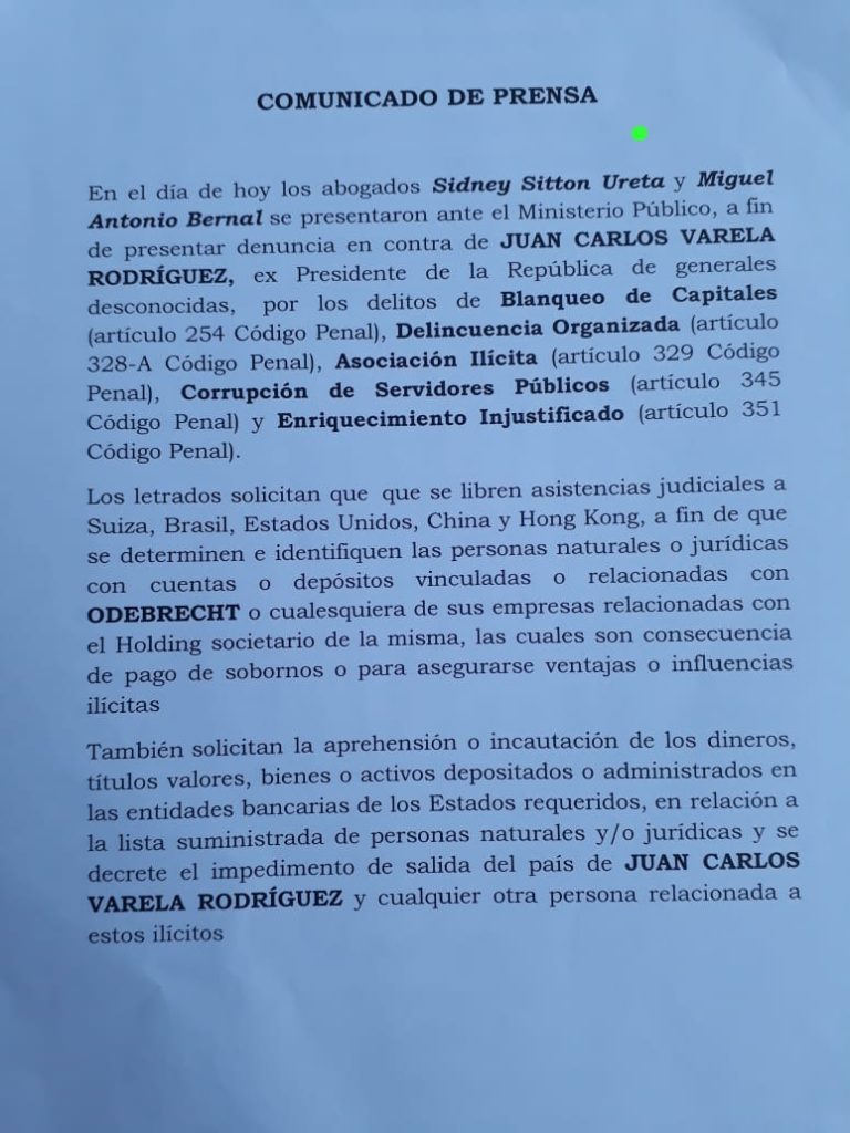 Este 17 de julio fue presentada una denuncia contra el expresidente de la República, Juan Carlos Varela, por los supuestos de delitos de blanqueo de capitales, delincuencia organizada, asociación ilítica, corrupción de servidores públicos y enriquecimiento injustificado.