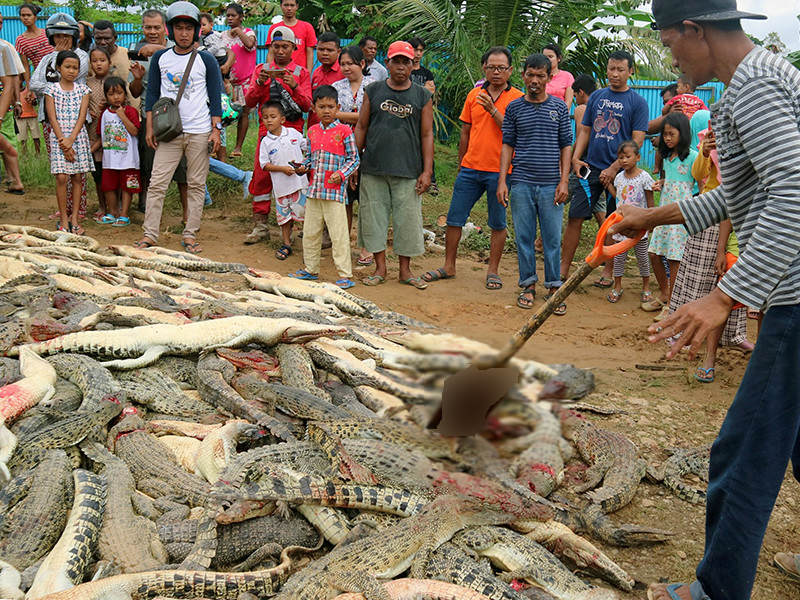 Una multitud de 600 locales se dirigió al estanque de los animales, los cercó, y los mataron con cuchillos después de atrapar uno a uno, así hasta un total de 292 cocodrilos.