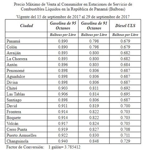 De acuerdo al listado de precios en las provincias de Panamá y Colón, la gasolina de 95 octanos aumentará +0.134 centavos el litro quedando en 0.890; la de 91 octanos subirá + 0.061 y quedará en 0.798 centavos. Mientras que el diésel tendrá un incremento de + 0.048 y costará 0.679.