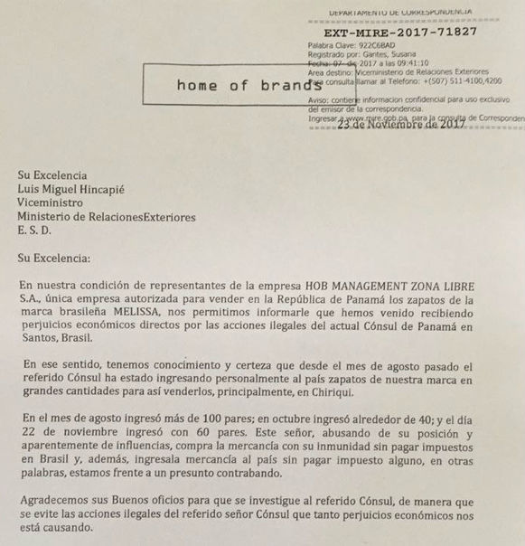 «Tenemos conocimiento y certeza que desde el mes de agosto pasado el referido cónsul ha estado ingresando personalmente al país zapatos de nuestra marca en grandes