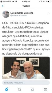 Por otro lado, el vocero del ex presidente Martinelli escribió en su cuenta de twitter «Cortizo está desesperado» refiriéndose a una nota de prensa en la que el expresidente Martinelli le retira el apoyo al candidato presidencial por el partido Cambio Democrático