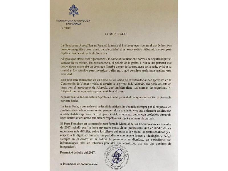 A través de un comunicado, la Nunciatura Apostólica en Panamá explicó el incidente ocurrido ayer jueves en las adyacencias de su sede, cuando un reportero gráfico del diario La Prensa fue detenido tras ser sorprendido utilizando un dron para captar vistas de esta sede diplomática.