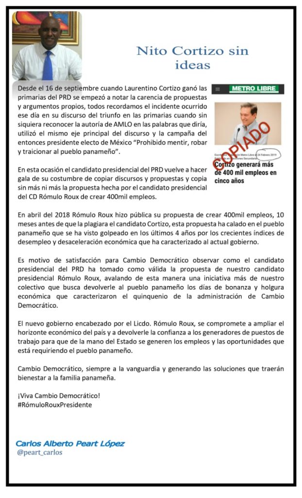 Varios partidarios de Cambio Democrático comentaron en redes que el aspirante presidencial del PRD, Laurentino Cortizo, se habría apropiado de una propuesta que ha hecho desde hace más de un año el también candidato a la primera magistratura, Rómulo Roux, de crear 400 mil empleos durante un eventual período gubernamental.