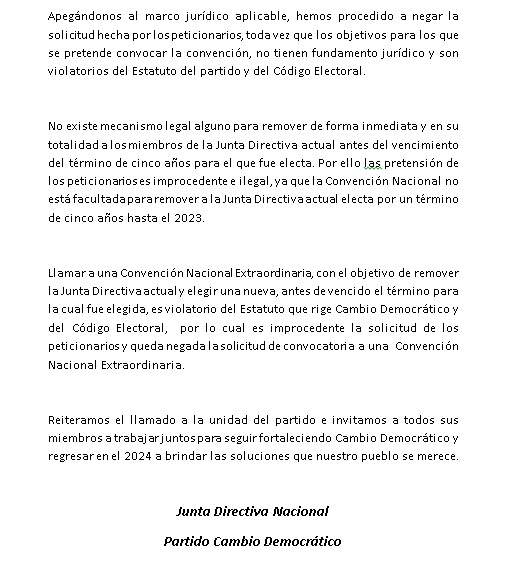 El Partido Cambio Democrático (CD) informó, a través de un comunicado, que negó la solicitud para que se realice una Convención Nacional Extraordinaria, que tenía el objetivo de remover a todos los miembros de la Junta Directiva actual electa de forma legítima y escoger una nueva a través de este mecanismo.
