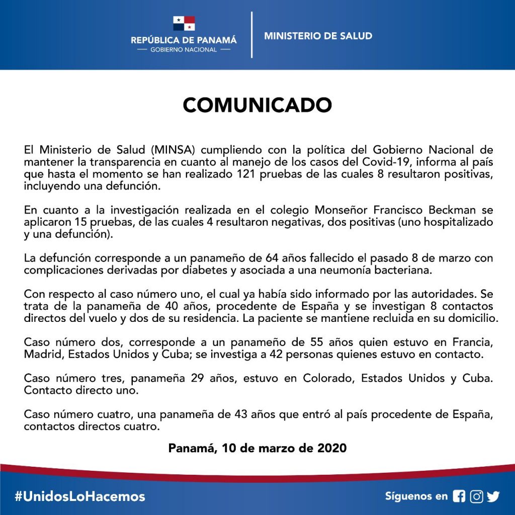 La ministra de Salud, Rosario Turner, confirmó este martes 10 de marzo, que actualmente hay ocho casos y un muerto por coronavirus en Panamá.