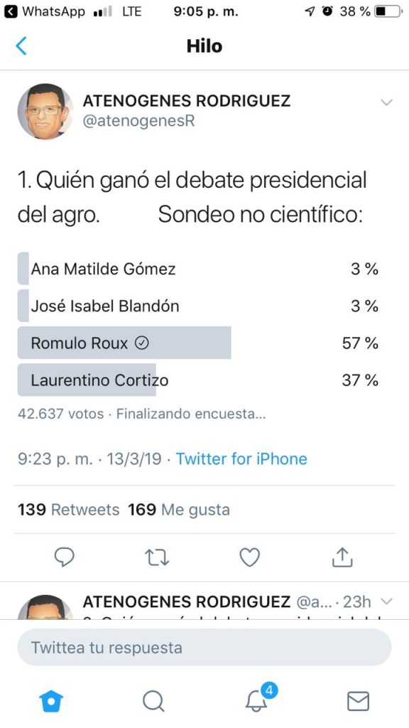 Un sondeo en redes sociales creado por el periodista Atenógenes Rodríguez en su cuenta en Twitter registró como ganador del debate del agro al candidato por Cambio Democrático, Rómulo Roux.