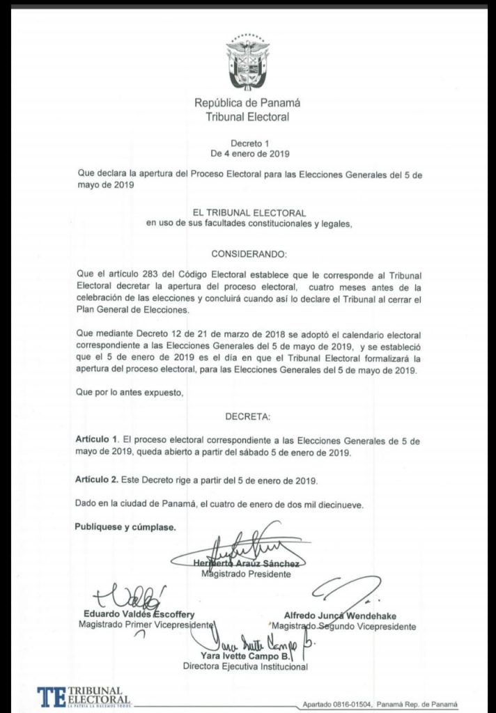 En el Decreto 1 del 4 de enero de 2019, el Tribunal Electoral  indicó que en uso de sus facultades constitucionales y legales decretaba «la apertura del proceso electoral, cuatro meses antes de la celebración de las elecciones y que concluirá cuando así lo