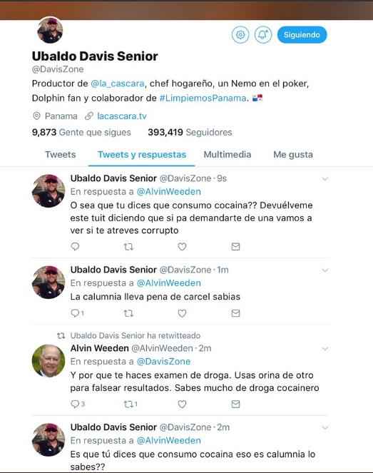 «Qué limitado intelectualmente eres. Estúpido si convocas a una marcha cállate la boca para que los que no te conozcam no te vean en el triste papel en que has estado esta noche. No seas torpe«, escribió Weeden a Davis Senior en su Twitter, luego de que este lo llamara en varias ocasiones corrupto y le hiciera un resumen de las supuestas propiedades adquiridas con dinero de dudosa procedencia.