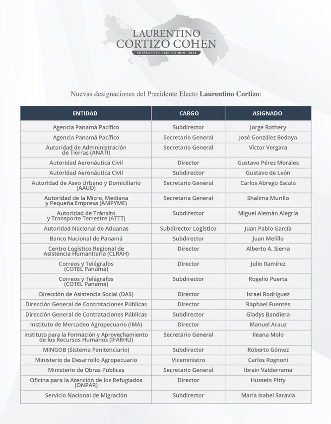 Este miércoles 26 de junio, el presidente electo Laurentino Cortizo dio a conocer un listado de designaciones para el gobierno que asumirá el próximo 1 de junio.