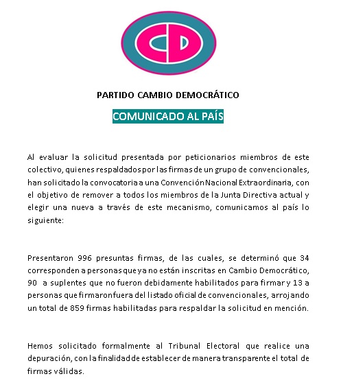 Según el comunicado del CD, se presentaron “996 presuntas firmas, de las cuales, se determinó que 34 corresponden a personas que ya no están inscritas en Cambio Democrático, 90  a suplentes que no fueron debidamente habilitados para firmar y 13 a personas que firmaron fuera del listado oficial de convencionales, arrojando un total de 859 firmas habilitadas para respaldar la solicitud en mención”.