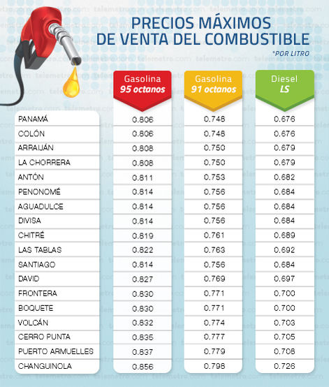 En Panamá y Colón, el costo la gasolina de 95 octanos será de B/. 0.806 (-0.084), mientras la de 91 octanos quedará en B/. 0.748 (-0.05). El litro de diésel presenta una leve baja a B/. 0.676 (-0.003).